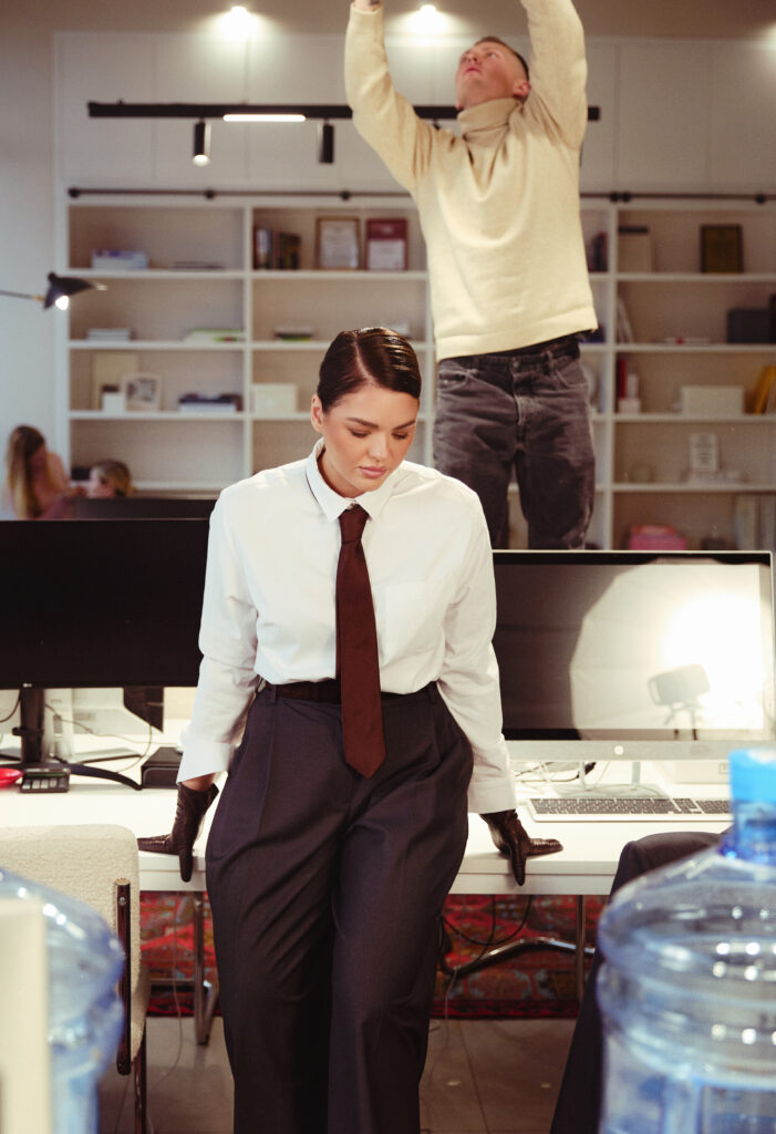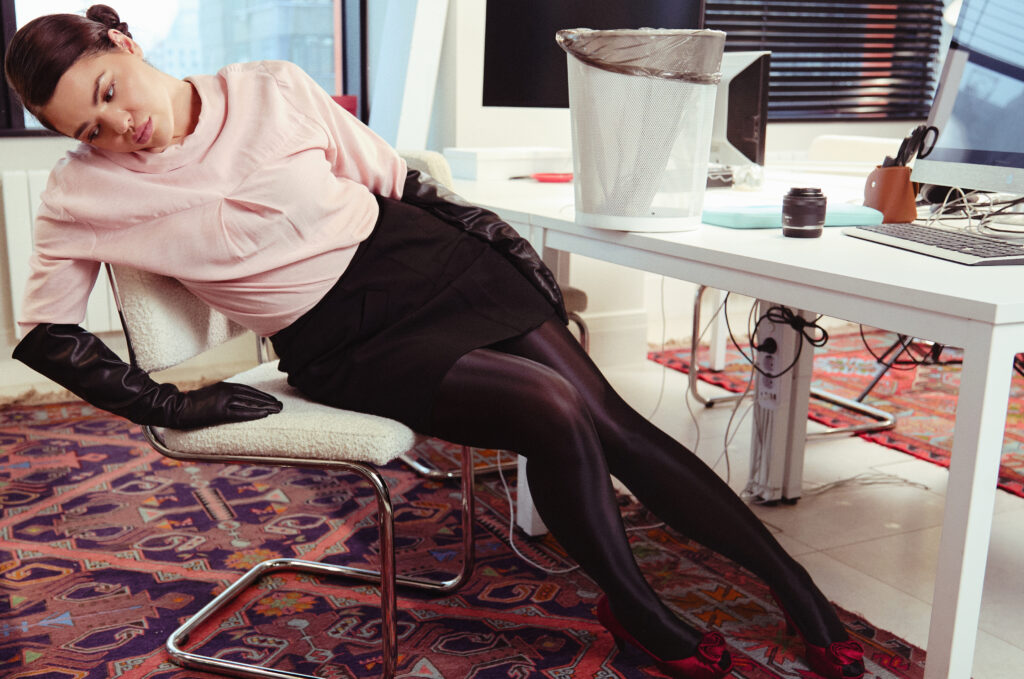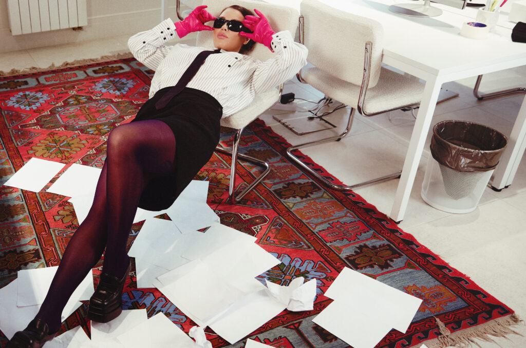 Праздники закончились, пространство пустое, начальник ещё не вернулся, коллеги где-то между «отпуском» и «реальностью». И в этом одиночестве неожиданно появляется свобода: можно вытянуть ноги, снять напряжение, опереться на стол, взять паузу, позволить себе быть живой — и при этом оставаться собранной, стильной и красивой.