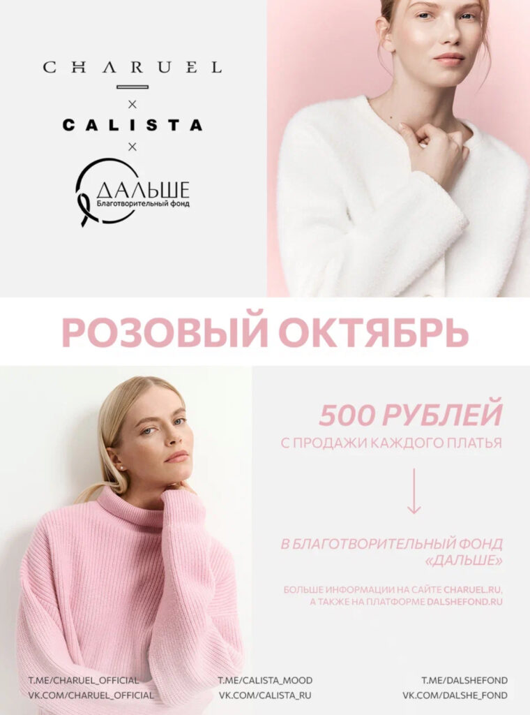 Российские бренды женской одежды Charuel и Calista считают важным заботиться о своем здоровье каждый день, включая регулярные обследования. Ранняя диагностика — ключ к успешному лечению, поэтому мы впервые участвуем в благотворительном проекте «Розовый октябрь». Для нас это важный шаг и начало системной работы в сфере социальной ответственности: поддержать тех, кто столкнулся с диагнозом, и напомнить всем о необходимости регулярных осмотров у маммолога.