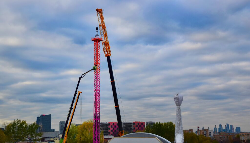 «Башня состоит из пяти секций. На земле элементы собираются попарно, после чего при помощи двух мощных кранов конструкции аккуратно поднимаются и переводятся в вертикальное положение — один кран удерживает нижнюю часть, второй —обеспечивает плавный подъём, и далее секции стыкуются друг с другом», — объясняет технический директор «Острова Мечты» Глеб Пауль.