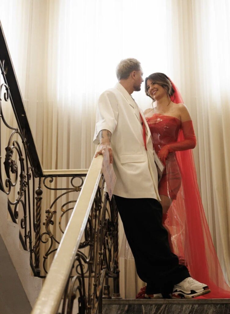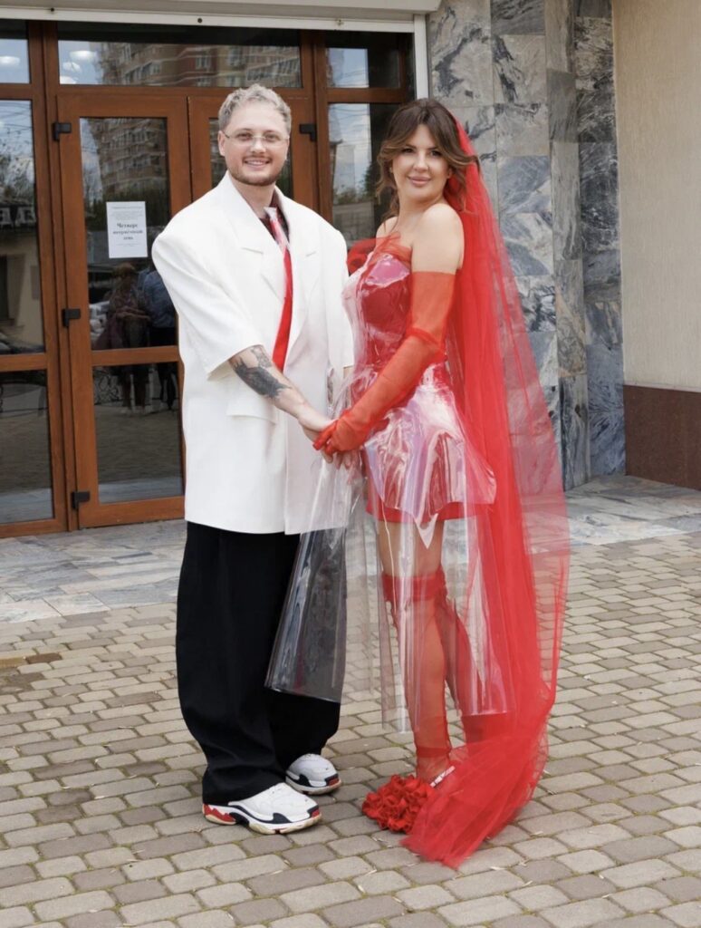 Невеста предстала в красном мини-платье, поверх которого был надет прозрачный «чехол» из пластика, дополнив образ чулками, перчатками и фатой в тон. Жених же выбрал массивный белый пиджак с прозрачными пластиковыми карманами – в них он положил совместные снимки с возлюбленной. Оказалось, что каждый элемент нарядов был продуман парой до мелочей.