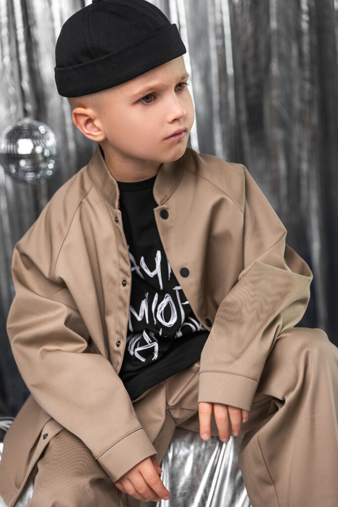 В линейке — актуальные модели для стильных мальчиков и девочек. Особое внимание привлекает пиджак с необработанными краями, жилет и классические брюки с отстрочкой. Не менее эффектен костюм с оригинальным принтом «Стихи не читаю, песни не пою» — дерзко и по-новогоднему празднично. Для подростков в коллекции представлены костюмы из джинсовой ткани — брюки с клапанами и рубашка с воротником-стойкой, которые современное поколение точно оценит.