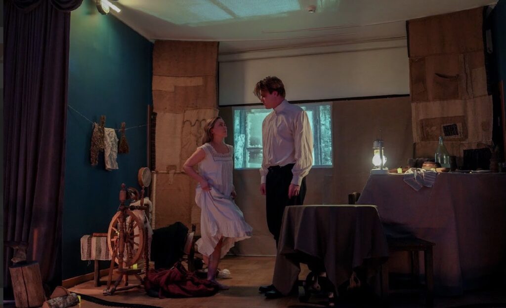 Как только погас свет в зале, зрители попали в настоящее иномирие, инобытие. Скудно обставленная церковная сторожка, имеющая лишь одно окно, – кажется, существует вне времени и пространства. Именно здесь разыгрывается финал житейской и бытовой драмы, действующими лицами которой становятся дьячок Савелий (Артём Григорьев) и его жена Раиса (Ольга Король), а также их случайные гости – молодой почтальон (Сергей Яковлев) и ямщик (Евгений Жигаленков).
